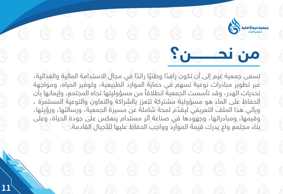 من نحن ؟ تسعى جمعية غيم إلى أن تكون رافد ً ا وطني ً ا رائدا في مجال الاستدامة المائية والغذائية، عبر تطوير مبادرات نوعية تسهم في حماية الموارد الطبيعية، وتوفير المياه، ومواجهة ً من مسؤوليتها تجاه المجتمع، وإيمانها بأن تحديات الهدر، وقد تأسست الجمعية انطلاقا الحفاظ على الماء هو مسؤولية مشتركة تتعزز بالشراكة والتعاون والتوعية المستمرة ، ّ ويأتي هذا الملف التعريفي ليقدم لمحة شاملة عن مسيرة الجمعية، ورسالتها، ورؤيتها، وقيمها، ومبادراتها، وجهودها في صناعة أثر مستدام ينعكس على جودة الحياة، وعلى ٍ بناء مجتمع واع يدرك قيمة الموارد وواجب الحفاظ عليها للأجيال القادمة.